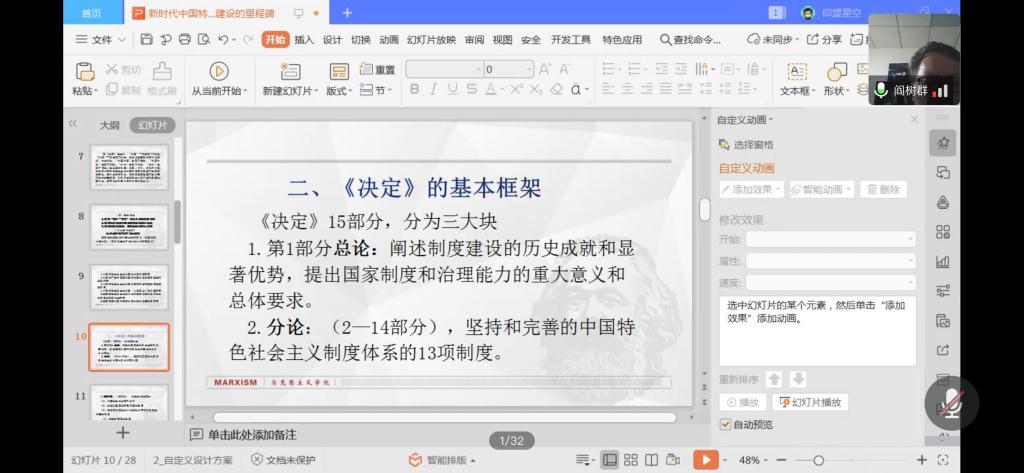 阎老师主要从五个方面帮助参会师生理解十九届四中全会精神:全会的历史地位和重大意义;《决定》的基本框架;中国特色社会主义制度和国家治理体系的显著优势;中国特色社会主义制度“图谱”;中国特色社会主义制度的理论创新。阎老师全面系统地为参会人员解读十九届四中全会精神,并对中国特色社会主义制度脉络进行详细梳理,讲清讲透了党对坚持和完善中国特色社会主义制度的现实意义和理论意义;阎老师也指出要充分和深刻的认识到习近平新时代中国特色社会主义思想是对马克思列宁主义、毛泽东思想、邓小平理论、“三个代表”重要思想、科学发展观的继承和发展,是马克思主义中国化最新成果,是党和人民实践经验和集体智慧的结晶,是中国特色社会主义理论体系的重要组成部分,是全党全国人民为实现中华民族伟大复兴而奋斗的行动指南。