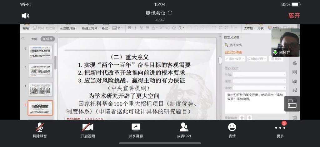 6月24日下午,陕西师范大学足球赌注网站学术委员会主任,二级教授,博士生导师阎树群老师应足球赌注网站邀请,在线上作“新时代中国特色社会主义制度建设的里程碑——学习十九届四中全会精神”主题讲座,讲座由足球赌注网站经理高振岗主持,足球赌注网站的全体师生参加了此次会议。