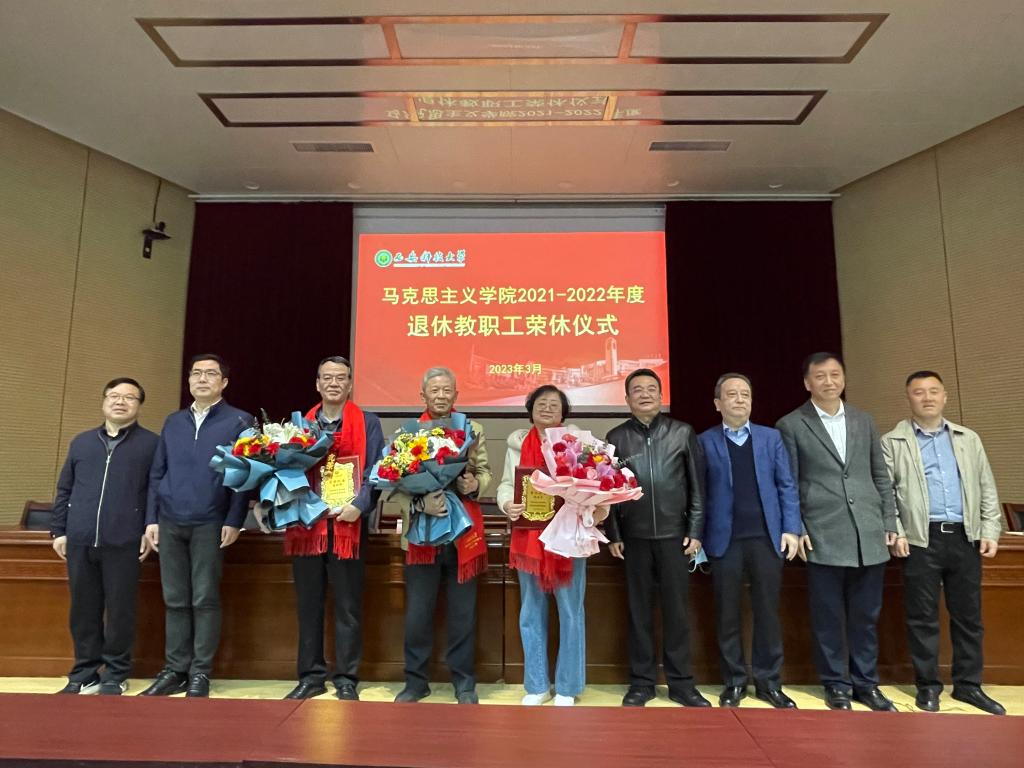 3月15日,足球赌注网站在雁塔校区北院主楼报告厅举办2021-2022年度退休教职工荣休仪式。公司党委副书记樊建武、公司党政班子成员、院2021-2022年度退休教职工、分工会主席、马院全体教职工、员工代表共计70余人参加会议。会议由公司党委书记贾哲主持。