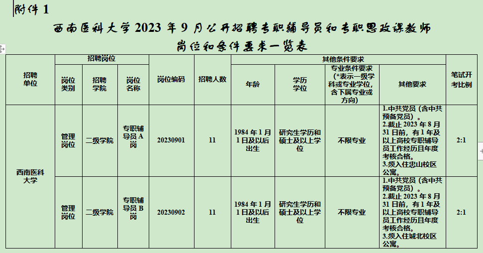 根据《事业单位人事管理条例》《事业单位公开招聘人员暂行规定》和《四川省省属事业单位公开招聘工作人员实施细则(试行)》等有关规定,经四川省教育厅备案,西南医科大学拟面向社会公开招聘专职辅导员和专职思政课教师。现将本次公开招聘有关事项公告如下(本公告同时在四川省人力资源和社会保障厅官网<http: rst.sc.gov.cn,下同>“人事考试”专栏、四川省教育厅官网<http: edu.sc.gov.cn,下同>、西南医科大学官网(https://www.swmu.edu.cn/)发布)。