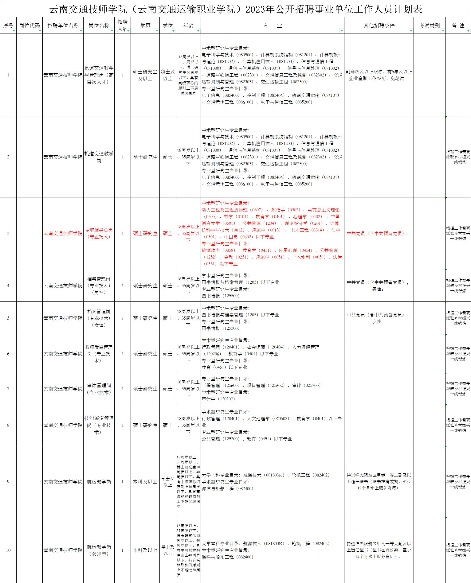 具体招聘岗位及招聘条件,详见《云南交通技师公司(云南交通运输职业公司)2023年公开招聘事业单位工作人员计划表》(附件1)。